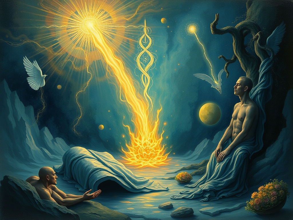 Keats said: “You can take any one great and spiritual passage and it will serve as a starting point to lead you to the two-and-thirty palaces.” Take this simple one in Paul’s letters to the Corinthians: “I die daily,” or Blake’s statement in his letter to Crab Robinson: “Death is the best thing in life. There is nothing in life like death, but people take such a long time in dying. At least, their neighbours never see them rise from the grave.” If you understood Blake you would not think of death as the world thinks of death, but you would see that no one can grow without outgrowing. But man is not willing to outgrow, [and] yet he wants other things than those he has. But if you remain in one state, you will forever have to suffer the consequences of not being in another state. (From the “Hermetica”) If I remain in the state of poverty, I must suffer the consequences of not being in the state of wealth. So I must learn the art of dying. Paul says: “I die daily.” Blake says: “People take such a long time in dying.” Man does not outgrow his state of ill health or his old job or his environment. We must learn the art of dying, and this week is the great death and we are told that God dies that man may live.